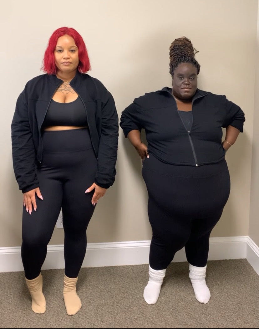 Model two (White Socks) is [4'11, 338 lbs, bra size 52 C] wearing a size 28/30